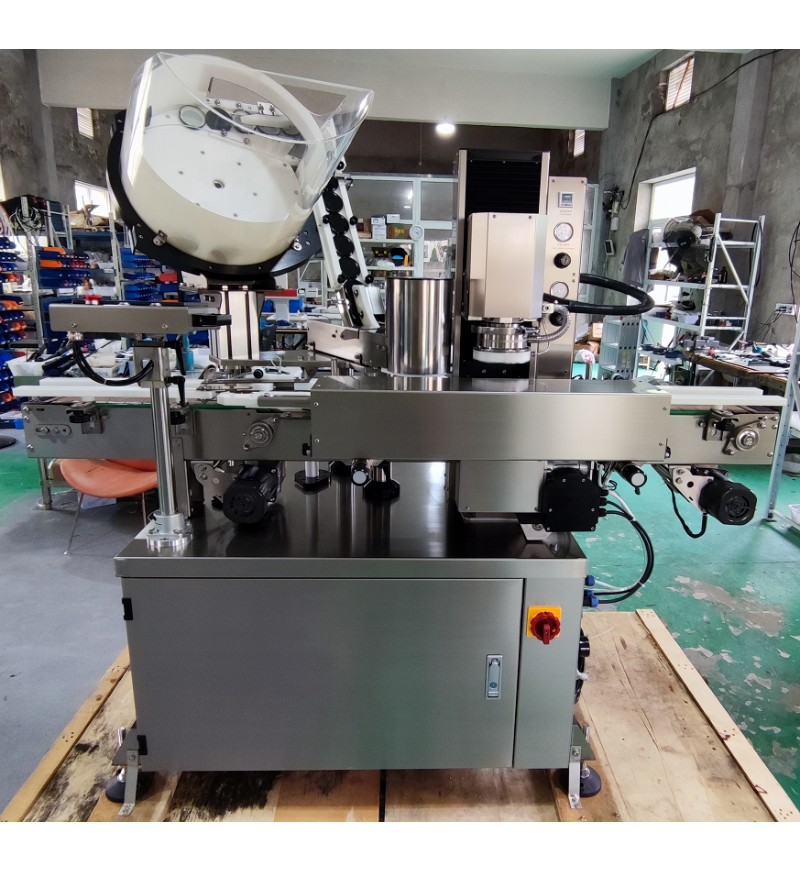 This machine is rearched and developed by our company with years of experience,it is unique in domestic.Integrated automatically cap arranging with covering.vacuum capping.Adopted manual vacuum pump to achieve high vacuum.With the functions of no bottie no covering. Alarming when no caps are available,Enjoyed high automation the main pneumatic and electric parts are from world famous brands.With stable and relialble performance.It is widely used for vacuum capping of the Glass Jars with iron caps in the industries of canned food,beverage,seasoning,health care products etc. Integrated automatically cap arranging with covering and vacuum capping ,with high automation.Adoptde vacuum pump to achieve high vacuum.Capping torsion and vacuum degree can be set as required.Suitable for different shapes and sizes bottles by changing few components.The main pneumatic and electric parts are from world famous brands to ensure stable,reliable and durable performance.