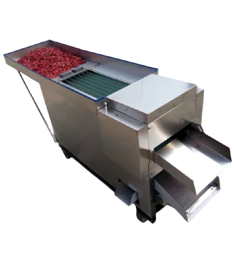 elects the iron filings and iron dust mixed in the material, which improves the service life of the hob. This equipment is operated by two people. The automatic pepper cutting machine is convenient and quick. It can cut pepper sections and dry.