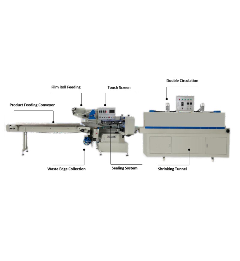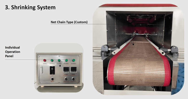 - PID temperature control. Suitable for various film. 6.Dual cycle for shrinking tunnel, ensure the shrink effect.