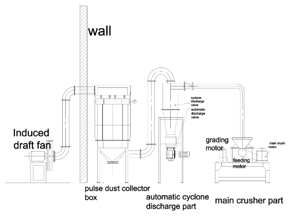 Material enters the mill chamber via screw conveyor where it is sheared and milled by fast-rotating blades. The powder passes the guide ring and enters the classifier chamber. As the classification wheel is in rotation, both air force and centrifugal force act on the powder. As the particles whose diameters are greater than the critical diameter (diameter of the classification particles) have a greater mass, they are thrown back into the mill chamber to be ground again, while the particles whose diameters are smaller than the critical diameter enter cyclone separator and dust-collecting box.