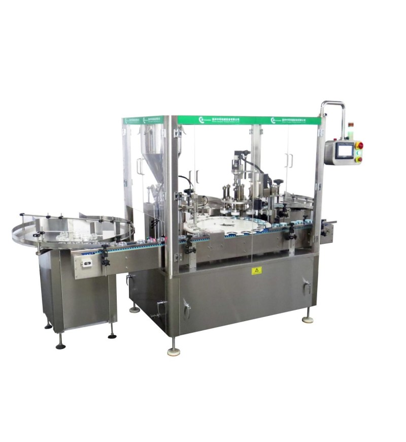 This machine has the function such as automatic screw type bottle feeding, bottle detecting (No bottle No Filling, No Bottle No Cap Feeding).