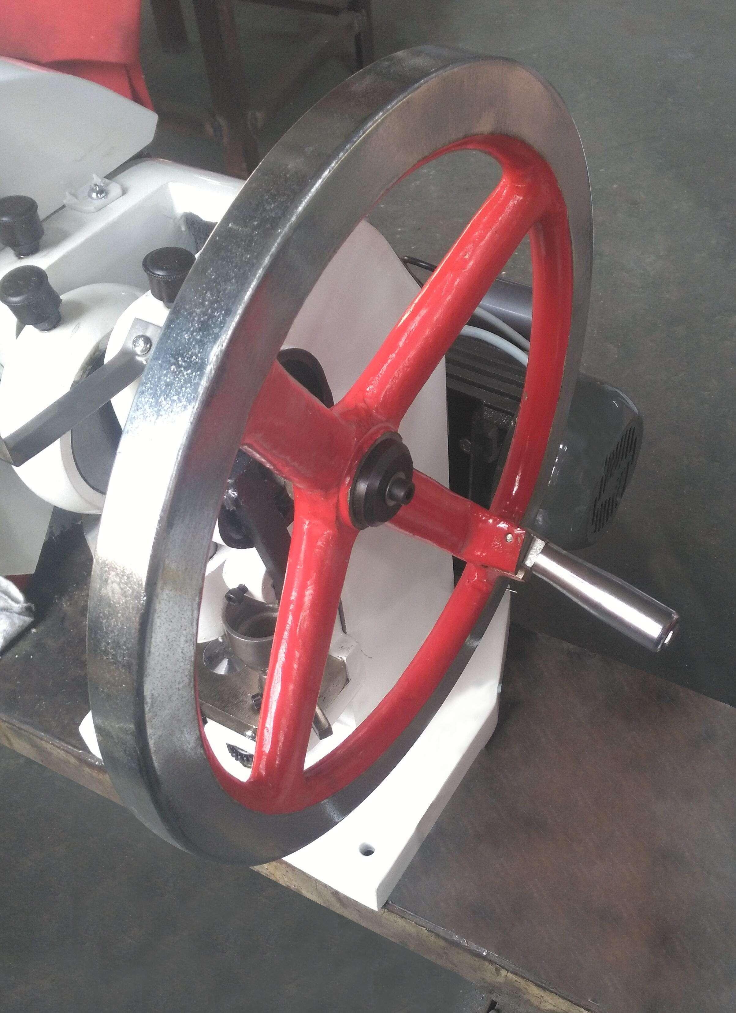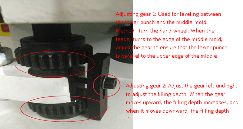 Method: When you need to adjust the pressure, first manually turn the wheel to move the upper mold into the middle mold to prevent the position of the upper punch and the middle membrane from being released. Then loosen the nut marked in red in Figure 1 and turn to the left to increase the pressure. Turning to the right reduces stress. After the pressure is adjusted in place, use a wrench to hold the nuts marked in red in Figure 1 and Figure 2 at the same time, and lock them in the opposite direction.