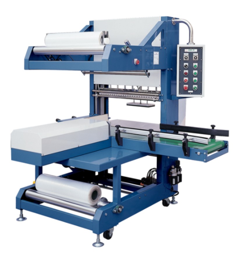 Automatic sleeve wrapping and applies Italian technology, electronic controlling, double sealing and cutting, auto film feeding auto shrink packing soft-drink, book, artware on salver or not; applies to drinks, beer, mineral water, pesticide and medicine line production.