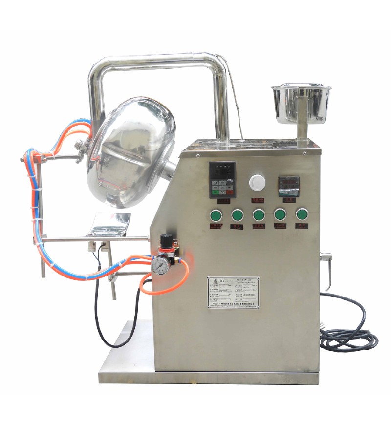 This machine is a equipment for coating Chinese and Western tablet cores with sugar coating and film coating. It is a new type of equipment that integrates strong electricity, weak electricity, hydraulics, and pneumatics, and transforms the original ordinary sugar coating machine. It is mainly composed of a host (original sugar coating machine), a controllable normal temperature hot air system, and a spray system for automatic liquid and air supply. The main motor can be adjusted by frequency conversion. It is automatically controlled by electrical appliances to spray the coating auxiliary materials on the surface of the tablet with a high atomization spray gun. At the same time, the tablet makes continuous and complex trajectory movement in the coating pan to make the coating liquid evenly Wrapped on the core of the tablet, there is controlled room temperature hot air in the pot to dry the tablets simultaneously, so that the surface of the tablet can quickly form a firm, dense, complete and smooth surface film.